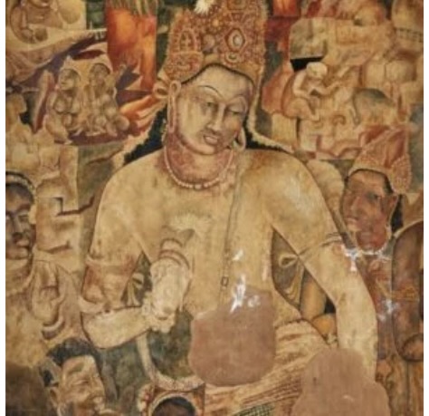 This is a famous painting from the Ajanta caves, which belonged to the Vakataka dynasty. It reflects the religious beliefs of that time. Varahadev, a minister of the Vakataka king, was a follower of Buddhism. The painting shows Bodhisattva Padmapani, who represents compassion and spiritual achievement. It tells us about the strong faith and dedication of the Buddhist people during that period.