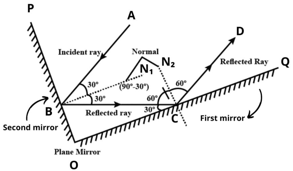 The reflecting surfaces of two mirrors make an angle of 90° with each other. If a ray incident on one mirror has an angle of incidence of 30°, draw the ray reflected from the second mirror. What will be its angle of reflection?